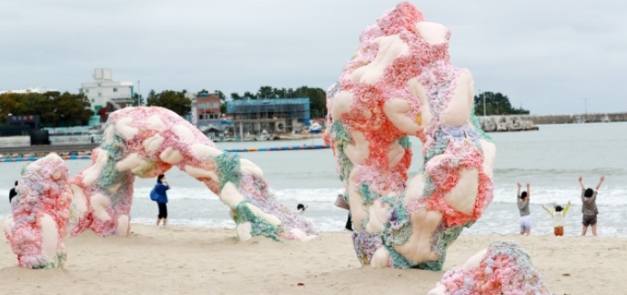모래로 만든 조각 작품은 부산바다미술제의 대표적인 작품 중 하나입니다. 모래로 만든 조각 작품들은 바다와 자연을 모티브로 하여 만들어지며, 그 자체로도 아름다운 작품을 만들어냅니다.