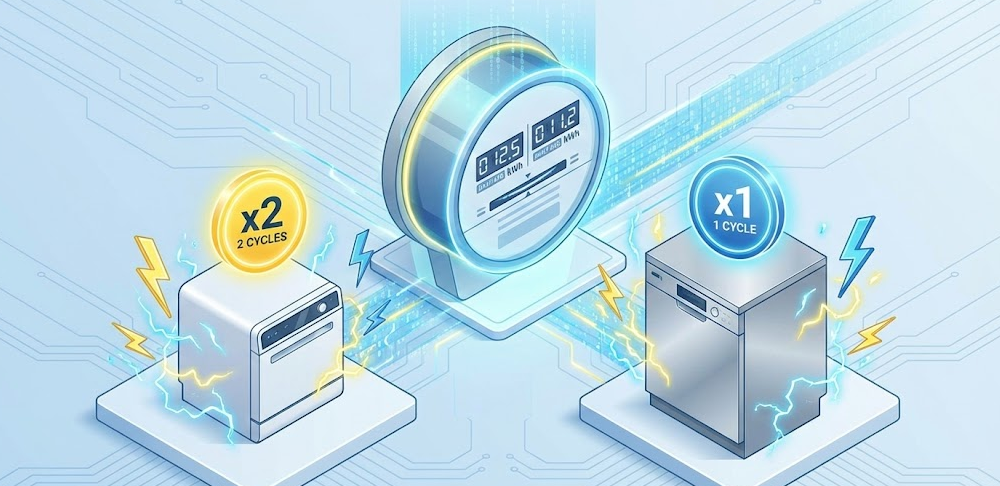 - 12인용: 보통 1회 세척 시 약 0.9 ~ 1.1kWh를 소모합니다.